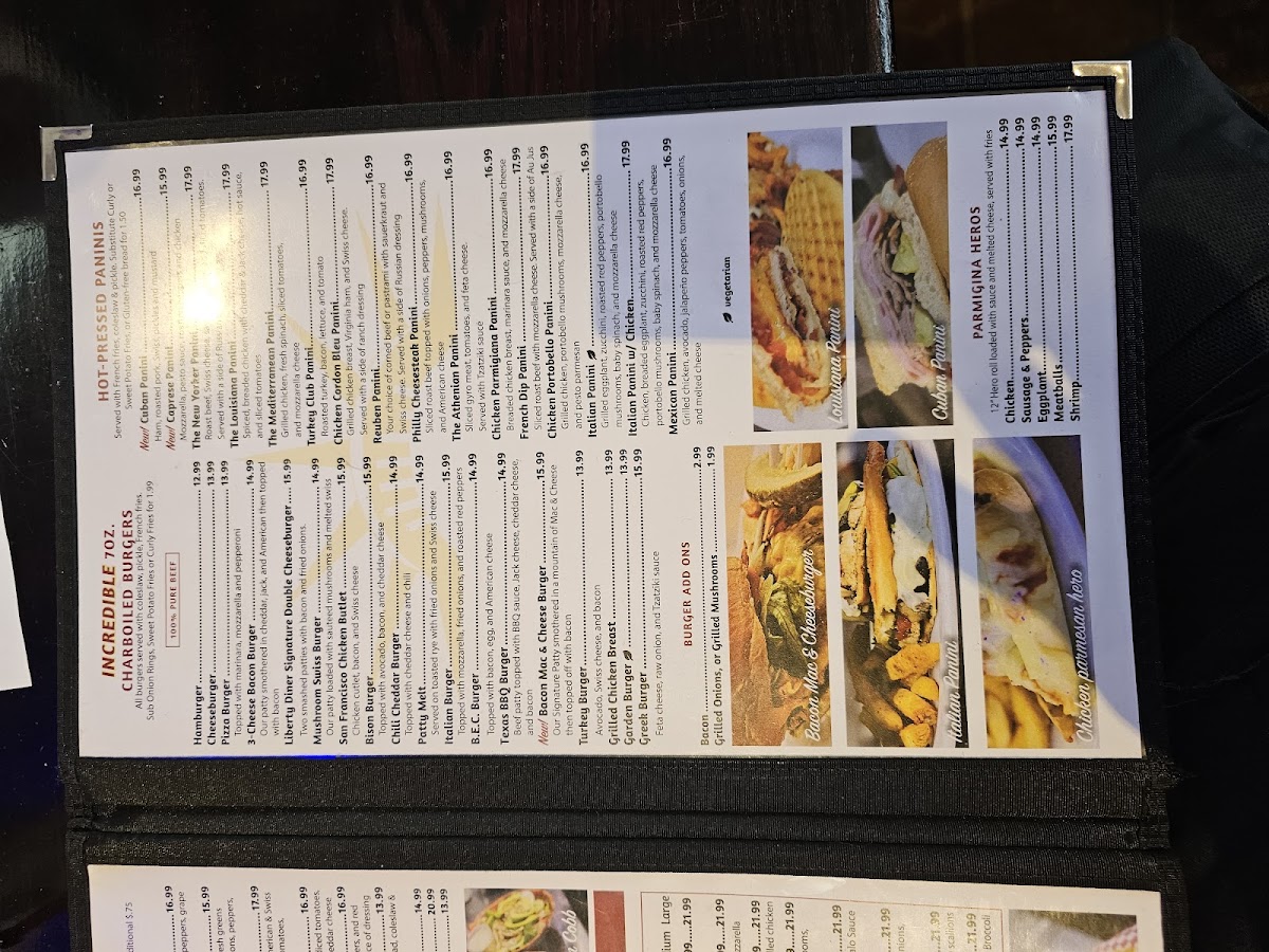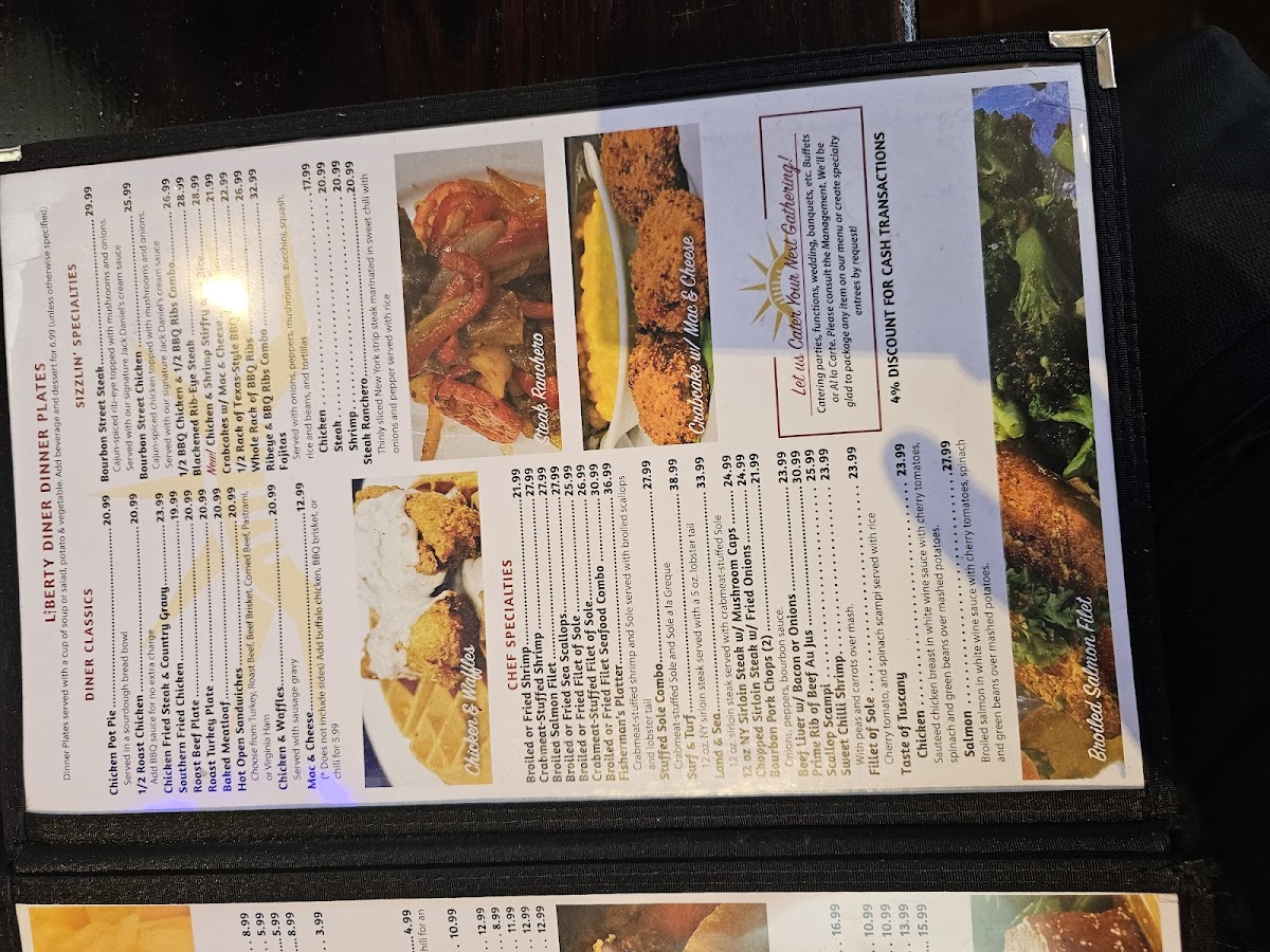 Start your day with the Liberty Breakfast Combo or indulge in brunch staples like Biscuits and Gravy or Chicken Fried Steak with Mashed Potatoes. As the day goes on, the menu shifts seamlessly into options like the Corned Beef Reuben, Philly Cheesesteak, or The Mediterranean Panini—each plate echoing the diner’s inviting, family-oriented setting.